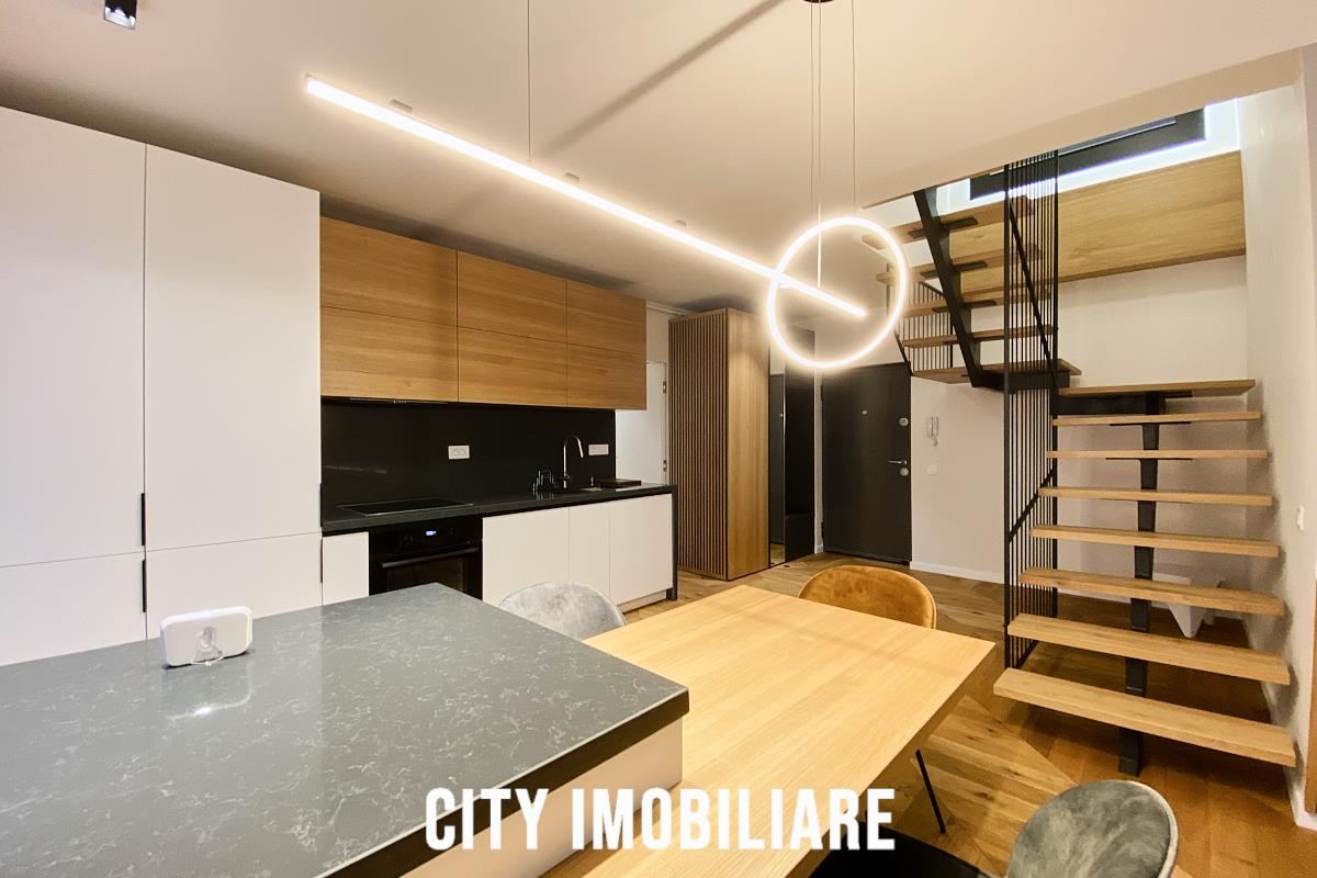 Apartamentul este compartimentat pe 2 nivele: - primul nivel: living openspace cu bucatarie si loc de luat masa, 1 baie, 1 balcon.