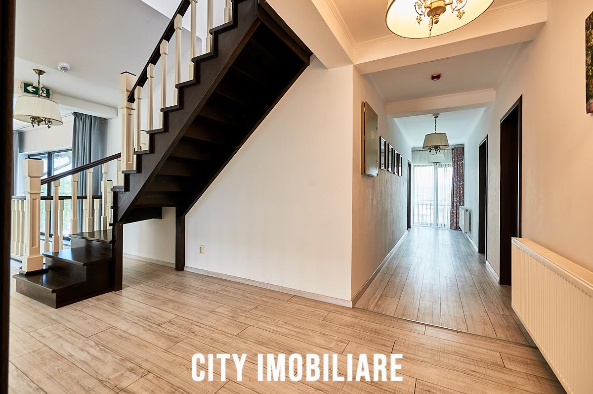 Etaj: 7 dormitoare cu bai proprii (toate cu geamuri), complet mobilate si utilate la standard hotelier.