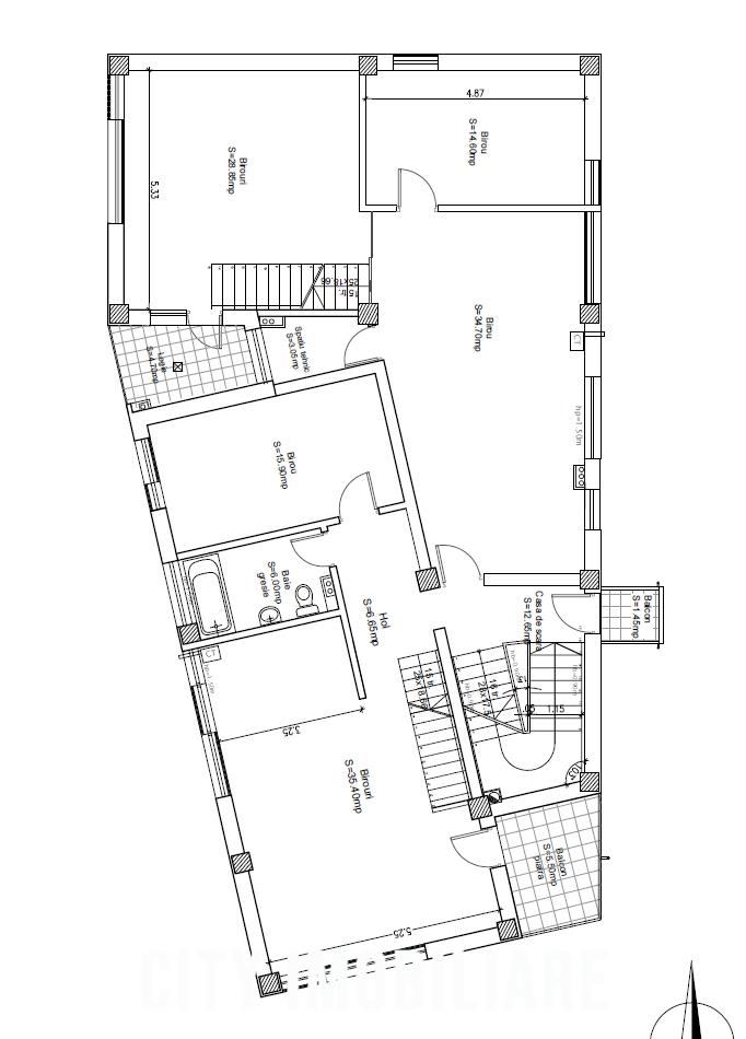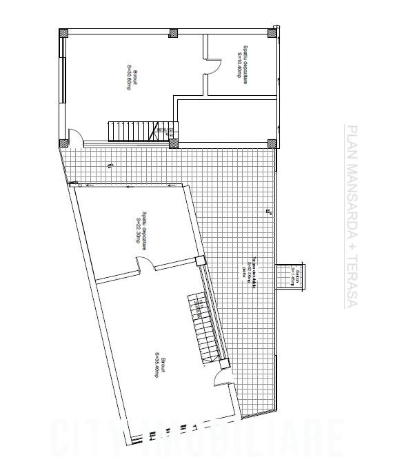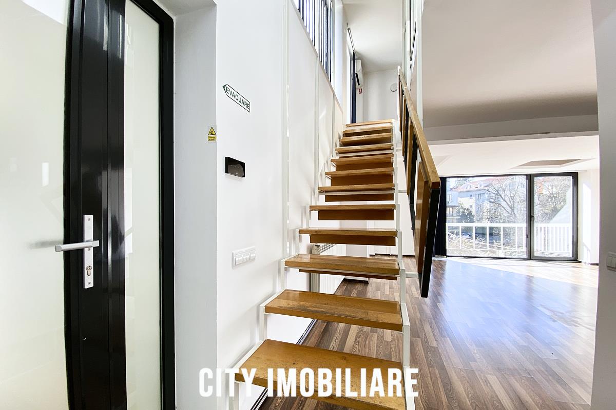 Compartimentarea este realizata pe doua niveluri: Etaj: 5 birouri, 2 bai, hol, 3 balcoane, scara interioara + Mansarda: 2 birouri, 2 spatii de depozitare, terasa de 52 mp.